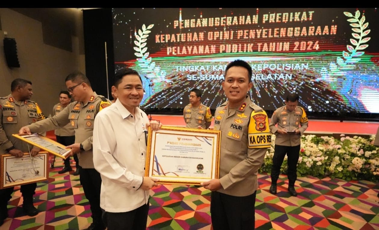 Penghargaan diserahkan langsung oleh Ketua Ombudsman RI diwakili Kepala Perwakilan Ombudsman RI Provinsi Sumatera Selatan M Adrian Agustiansyah kepada Kapolres Banyuasin AKBP Ruri Prastowo.