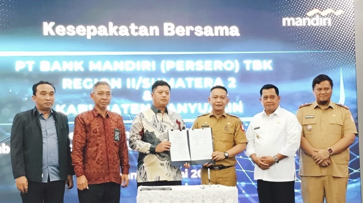 Bupati Banyuasin H Askolani didampingi Sekretaris Daerah Erwin Ibrahim menandatangani Memorandum Of Understanding (MoU) Dalam Pemanfaatan Produk dan Pelayanan Jasa Perbankan bersama PT Bank Mandiri yang diwakili Area Head Bank Mandiri Area Palembang Arif Stefan Anggana Putra.