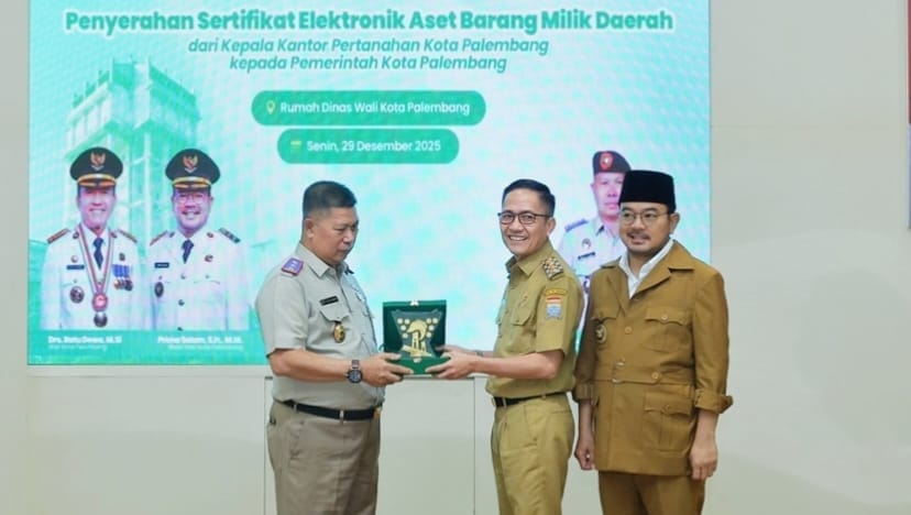 Palembang, bukanisu.com – Kantor Pertanahan BPN Kota Palembang secara resmi serahkan 30 Sertifikat Elektronik Aset Barang Milik Daerah ke Pemerintah Kota (Pemkot) Palembang, Senin (29/12/25).