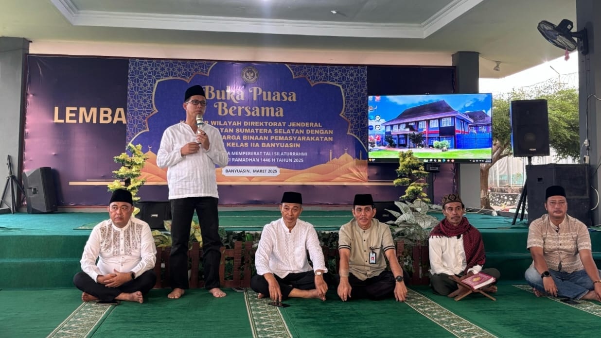 Perwakilan Kanwil Ditjenpas Sumsel I Wayan Tapa Diambara buka puasa bersama dengan Warga Binaan Pemasyarakatan (WBP) Lapas Banyuasin. Jumat (22/3/25).