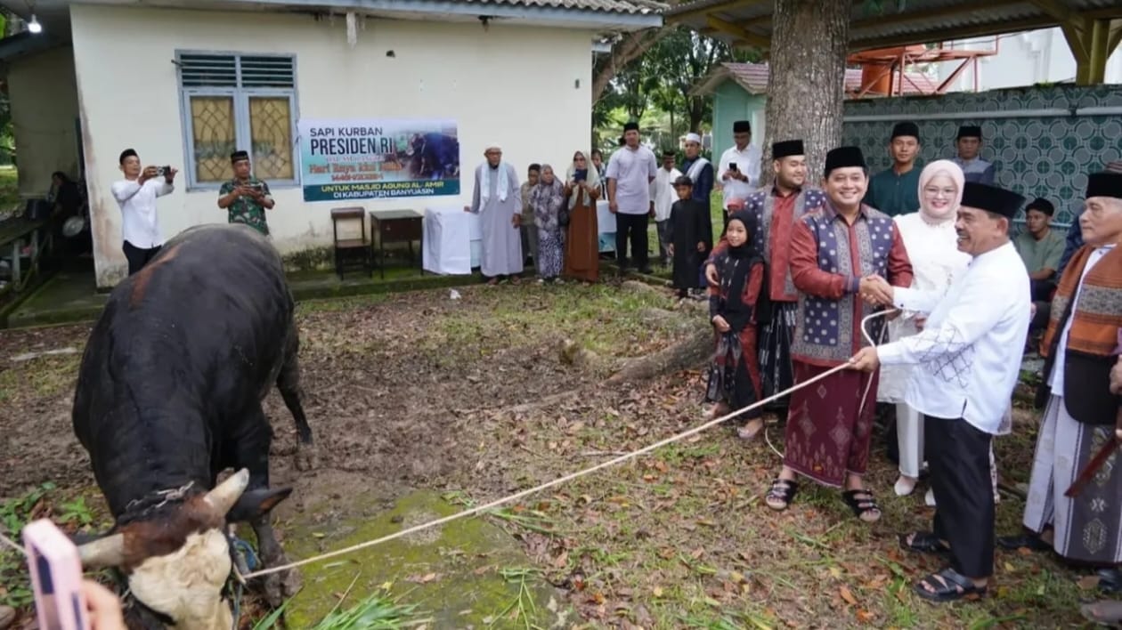Dalam kesempatan tersebut, Bupati menyerahkan Satu ekor sapi qurban dari Presiden Republik Indonesia serta Satu ekor sapi dari Pemerintah Kabupaten Banyuasin.