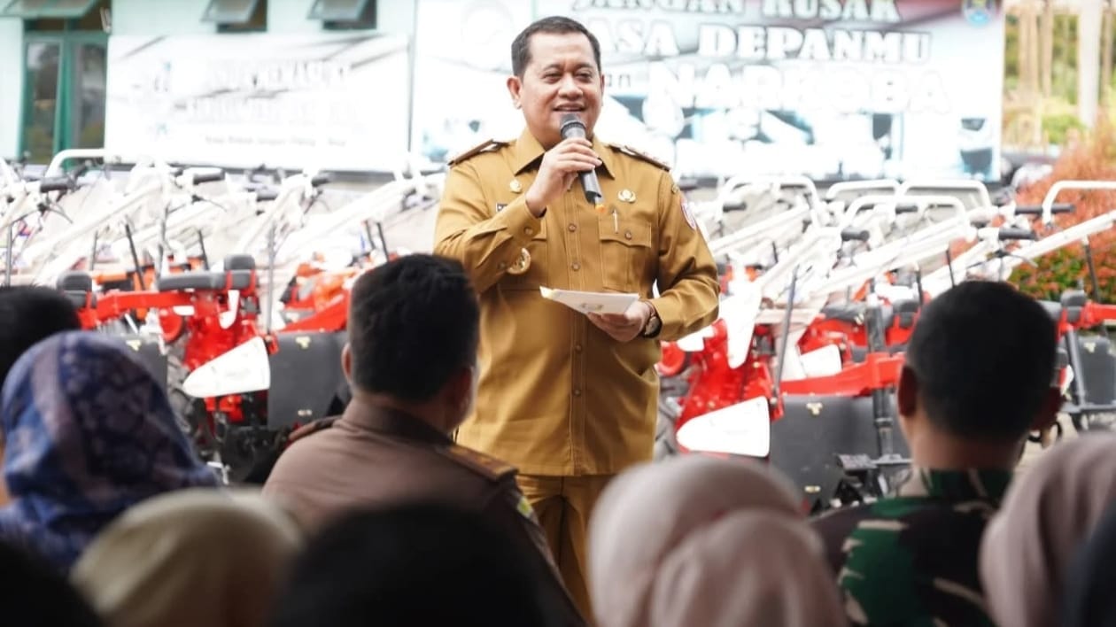 Bupati Banyuasin Dr H Askolani SH MH secara simbolis serahkan Alat dan Mesin Pertanian (Alsintan) kepada para Brigade Pangan Banyuasin berlangsung di Markas Komando Distrik Militer (Makodim) 0430 Banyuasin, Selasa (04/3/25).