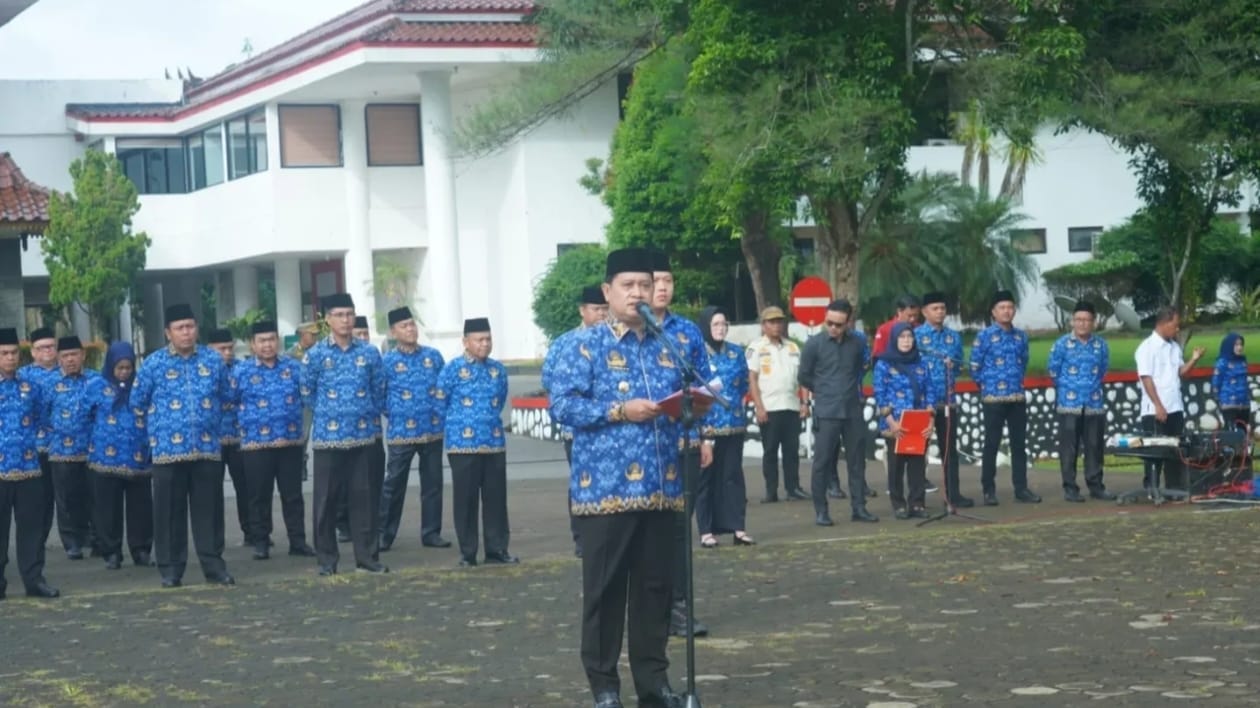 Bupati Banyuasin Dr H Askolani SH MH memimpin Apel Gabungan Bulan April 2025 di Halaman Upacara Pemkab Banyuasin, Kamis (17/4/25).