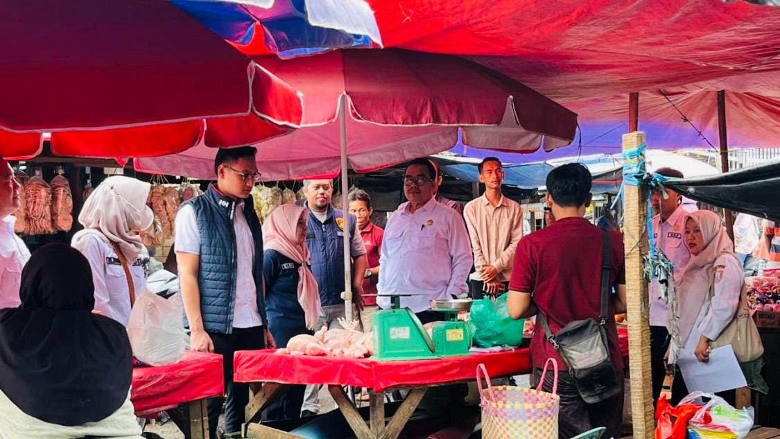 Kepala Dinas Koperasi Perindustrian dan Perdagangan (Koperindag) Banyuasin Adam Ibrahim melaksanakan Inspeksi Mendadak (Sidak) Pasar Pangkalan Balai bersama Dinas Ketahanan Pangan dan Polres Banyuasin, Rabu (24/12/25).