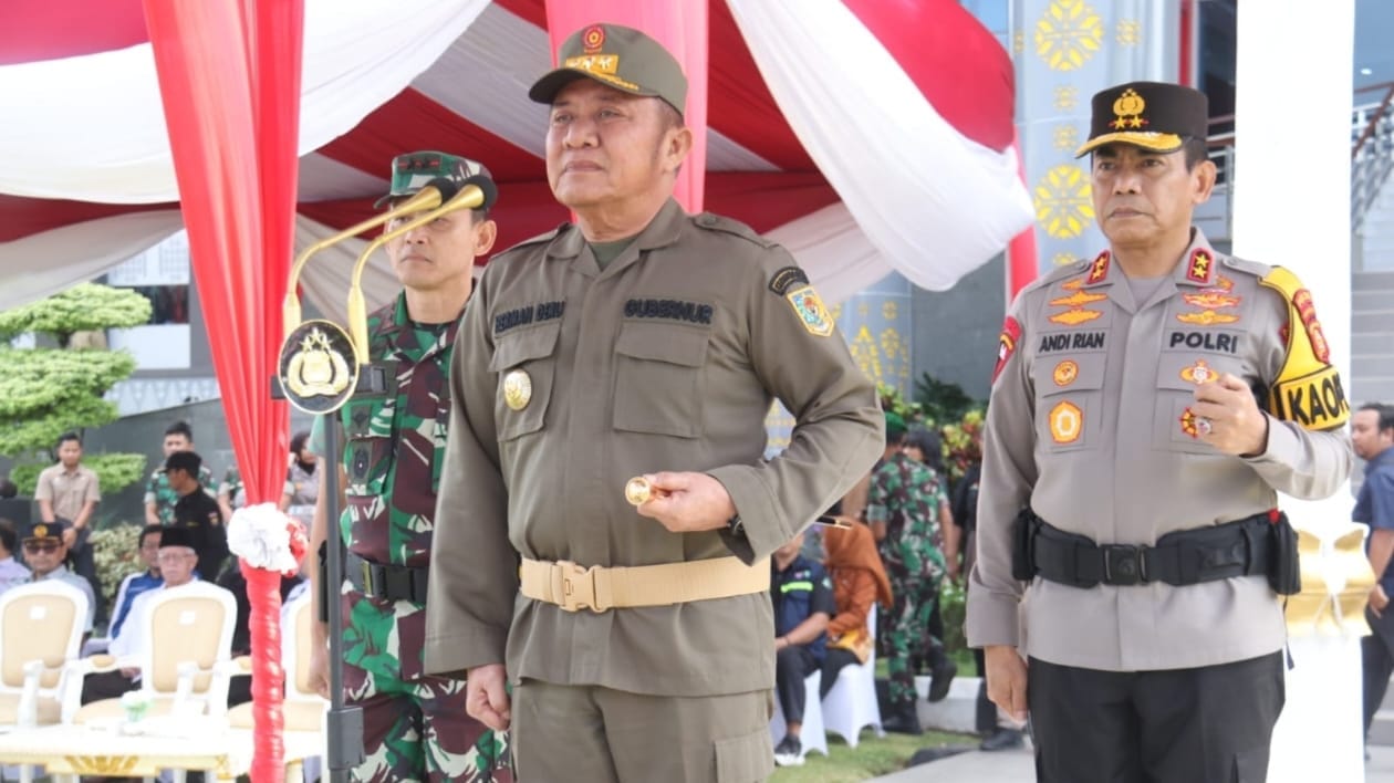 Gubernur Sumatera Selatan H Herman Deru pimpin Apel Gelar Pasukan Ketupat Musi Tahun 2025 di halaman Mapolda Sumsel Palembang, Jumat (21/3/25).