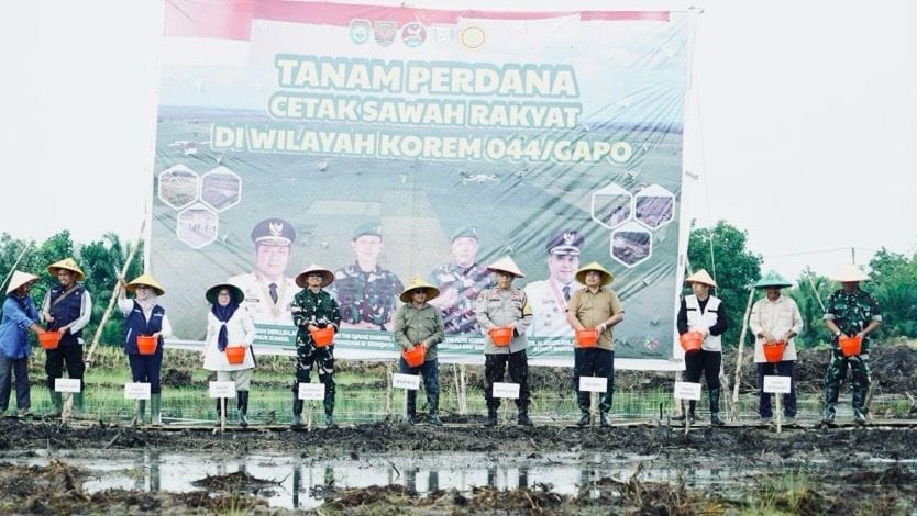 Melaksanakan kegiatan perdana cetak sawah rakyat di wilayah Korem 044/Gapo di Desa Sako Makmur Kecamatan Sembawa, Minggu (30/11/25).