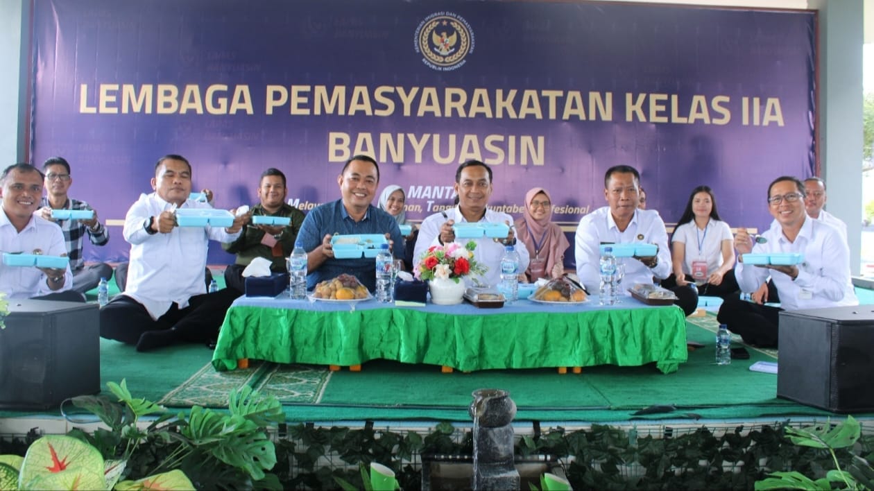 BI – Kepala Kantor Wilayah Direktorat Jenderal Pemasyarakatan Sumatera Selatan Erwedi Supriyatno makan siang bersama dengan warga binaan Lapas Kelas IIA Banyuasin, Kamis (27/2/25).