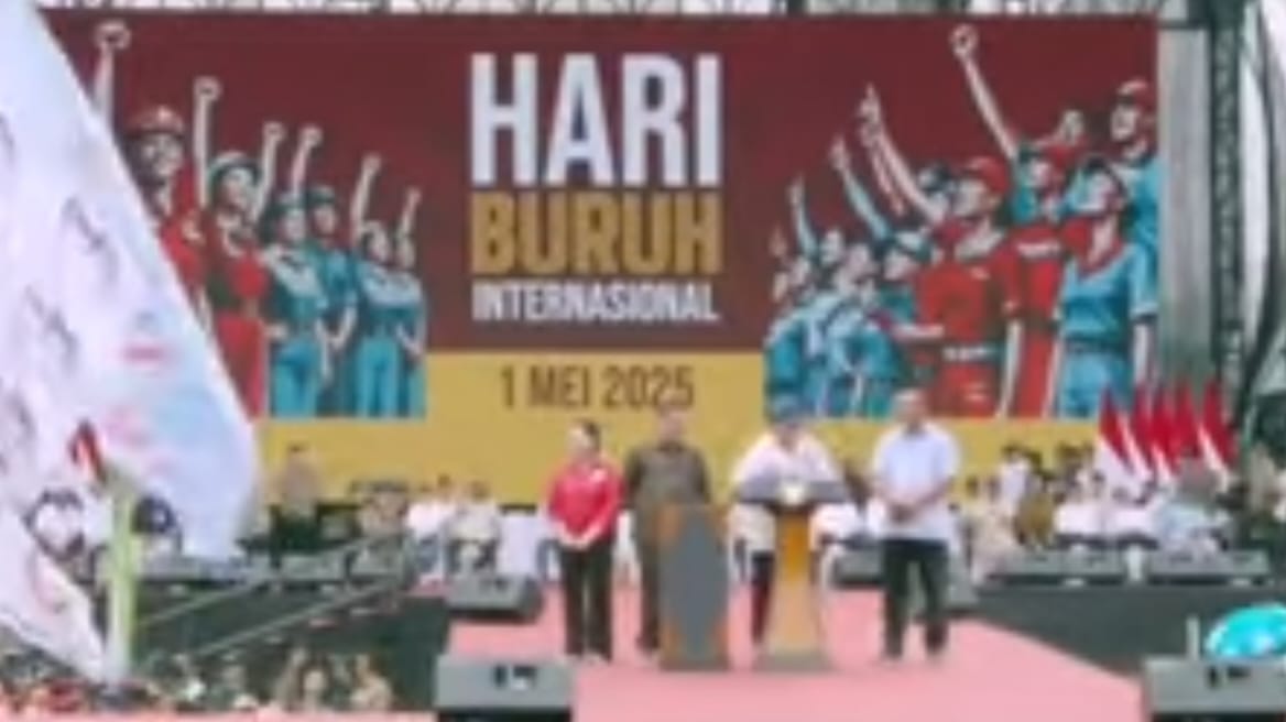 Hari Buruh Internasional “May Day” Presiden Republik Indonesia Prabowo Subianto merayakannya bersama puluhan ribu buruh hingga sederet Menteri dan politikus partai Gerindra hadir di kawasan Monas Jakarta, Kamis (1/5/25).