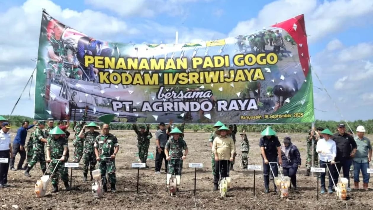 Banyuasin I – Dalam rangka terus mendukung ASTA CITA Presiden Republik Indonesia dalam memperkuat ketahanan pangan di Indonesia, Pemerintah Kabupaten Banyuasin dan Kodam II/Sriwijaya bersama PT Agrindo Raya terus memaksimalkan serta memanfaatkan lahan untuk meningkatkan produksi padi dengan menanam Padi Gogo di Desa Pematang Palas Kecamatan Banyuasin I, Kamis (18/9/25).