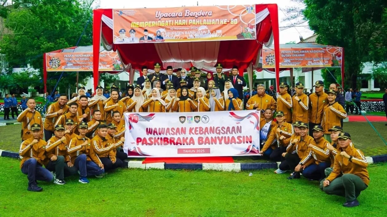 BukanIsu, Pangkalan Balai – Bupati Askolani melepas kontingen Paskibraka Kabupaten Banyuasin menuju Akademi Militer Magelang Jawa Tengah untuk melaksanakan kegiatan Wawasan Nusantara berlangsung di lapangan upacara Pemkab Banyuasin, Senin (10/11/25).