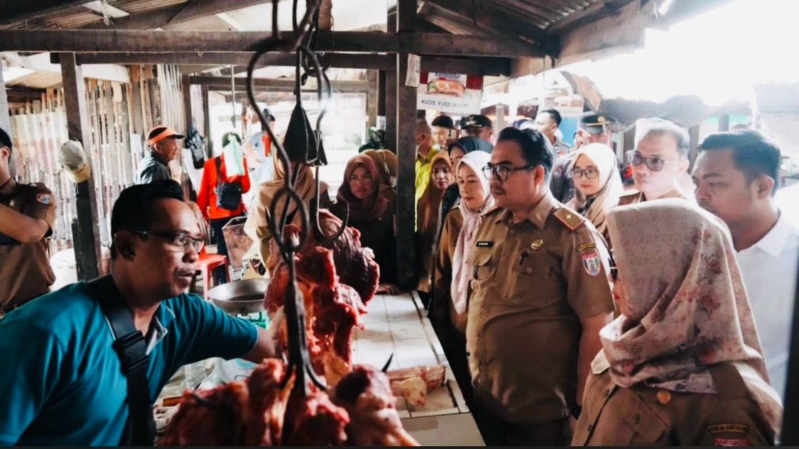 Mewakili Bupati Banyuasin Kepala Dinas Koperasi UKM dan Perdagangan Banyuasin, Adam Ibrahim, bersama Kepala DKP Banyuasin, Masita LianaCamat Talang Kelapa Salinan melakukan sidak harga dan stok barang di Pasar Tradisional Kenten Azhar. Selasa (17/3/2026)