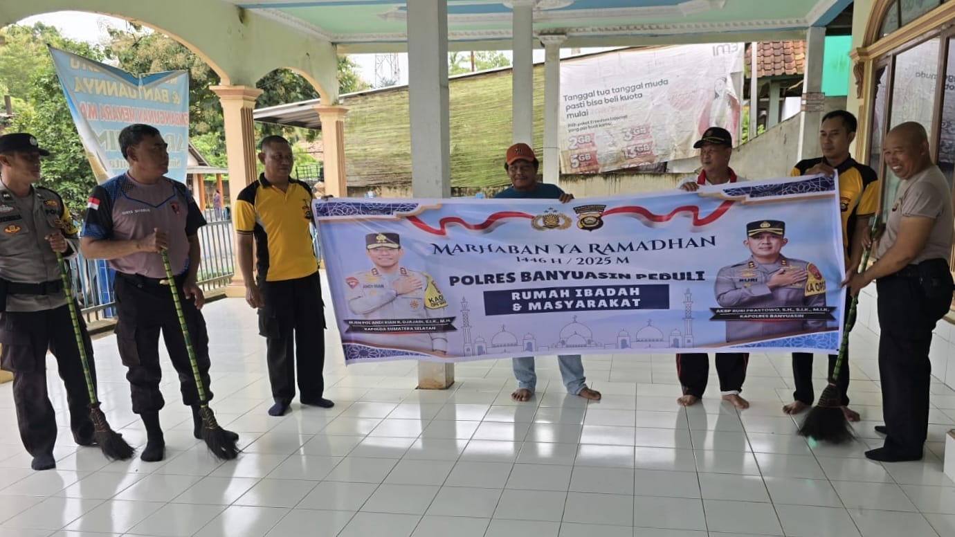 Polsek Rambutan Bagikan Sembako Bersihkan Masjid