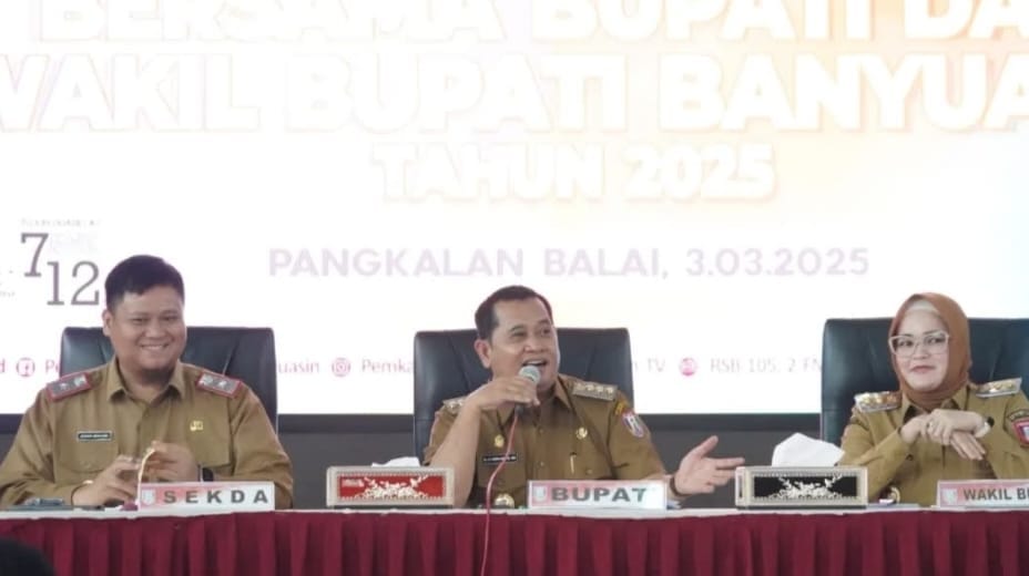 Didampingi Wakil Bupati Banyuasin Netta Indian SP dan Sekda Banyuasin Ir Erwin Ibrahim ST MM MBA IPU ASEAN Eng di gedung Graha Sedulang Setudung, Senin (3/3/25).