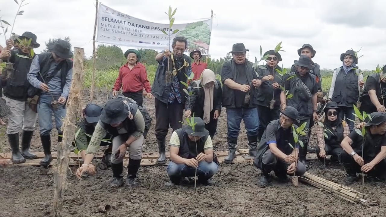 SKK Migas dan KKKS Sumbagsel bersama Forum Jurnalis Migas (FJM) lakukan Field Trip untuk penanaman pohon Mangrove ke desa Sungsang IV kecamatan Banyuasin 2 kabupaten Banyuasin Sumatera Selatan, Selasa (19/8/25)
