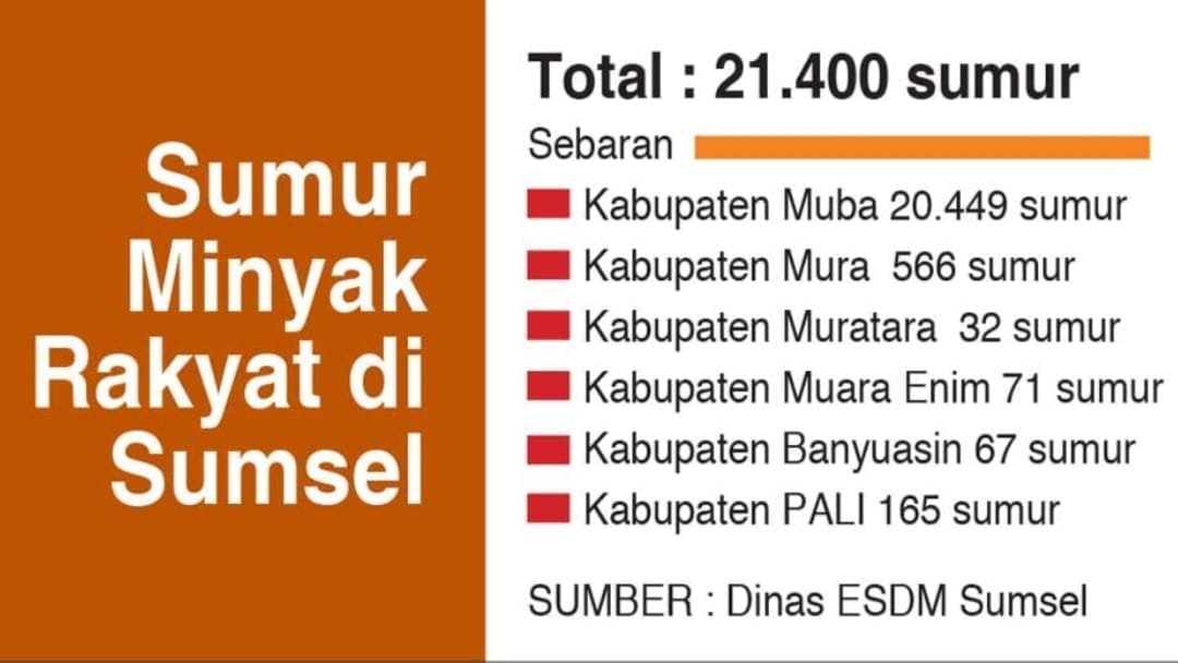 Kepala Dinas Energi dan Sumber Daya Mineral (ESDM) Provinsi Sumsel Hendriansyah ST MSi melalui Kepala Seksi Minyak dan Gas Bumi Haitami Hakim Pulungan ST menjelaskan, sebanyak 21.400 sumur minyak itu tersebar di enam kabupaten. “Itu ada yang dikelola resmi maupun oleh masyarakat,” jelasnya.